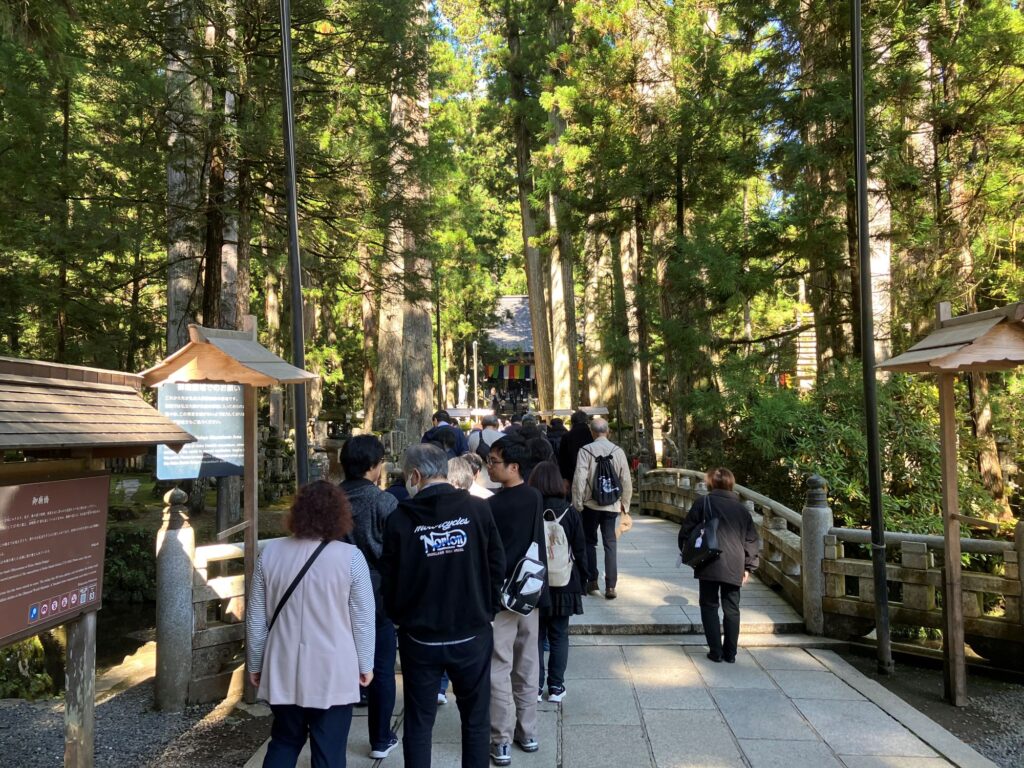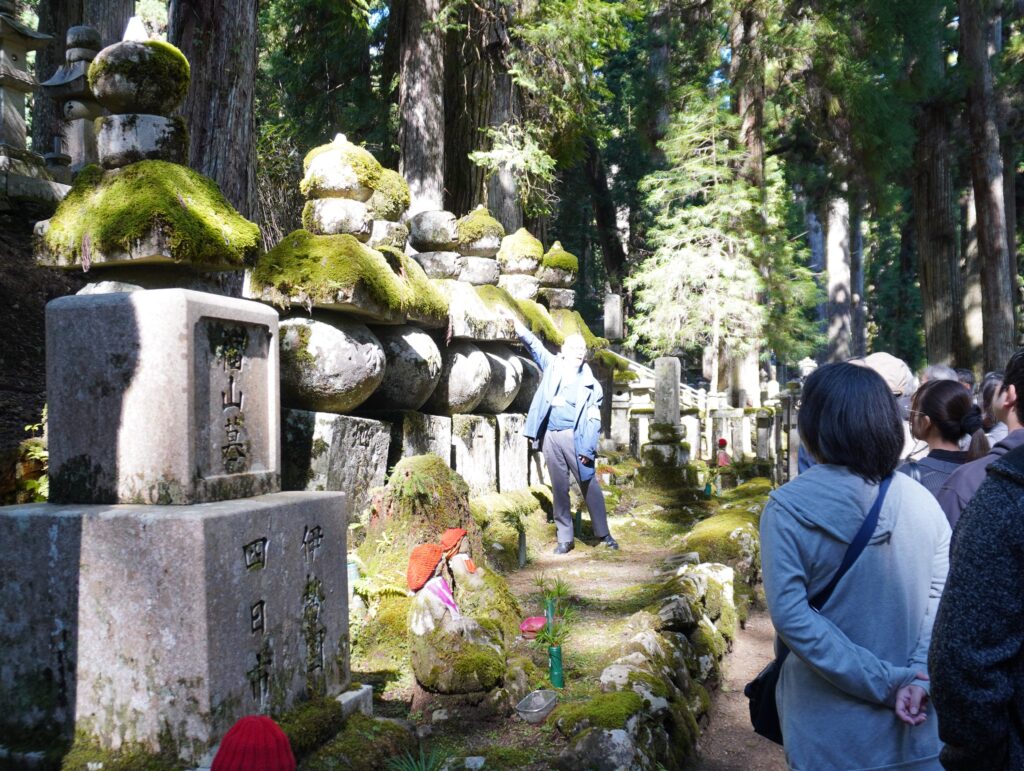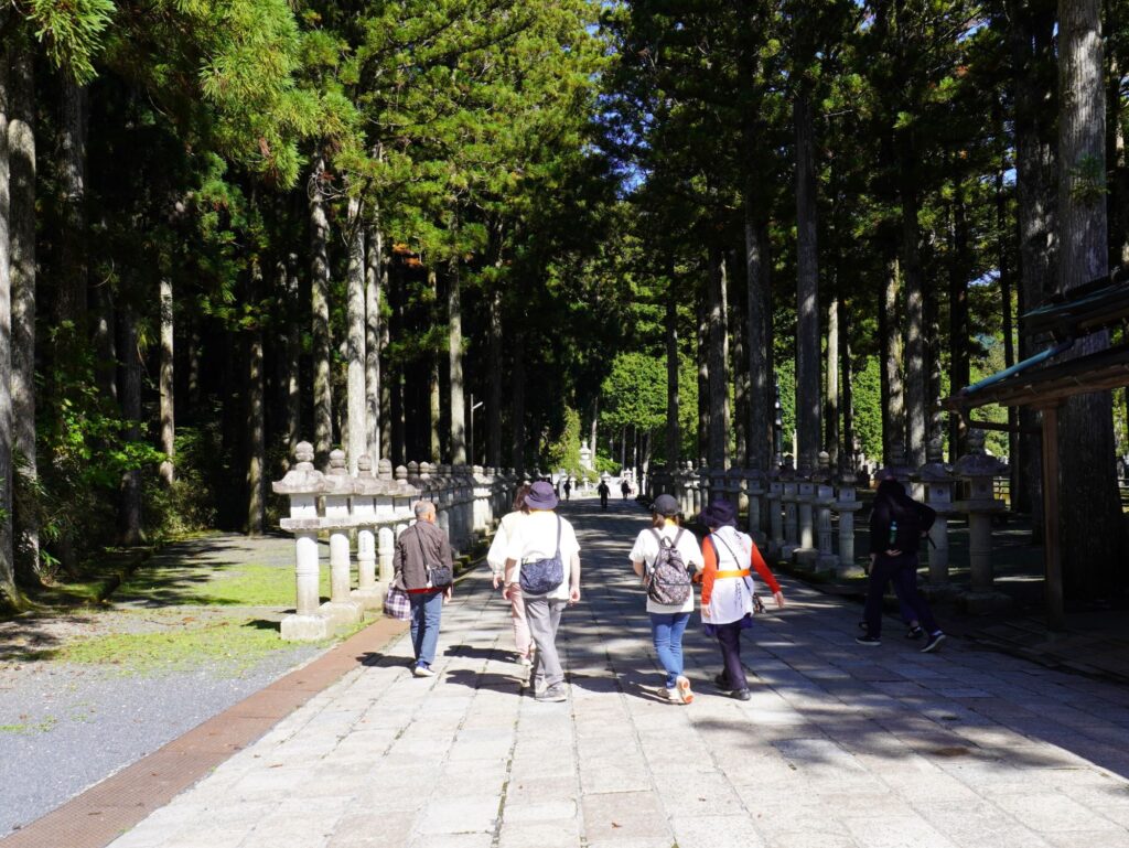 バスを降り、現地の案内の方とともに、空海が今なお瞑想を続けていると伝えられる「奥之院」へ向かいます。
