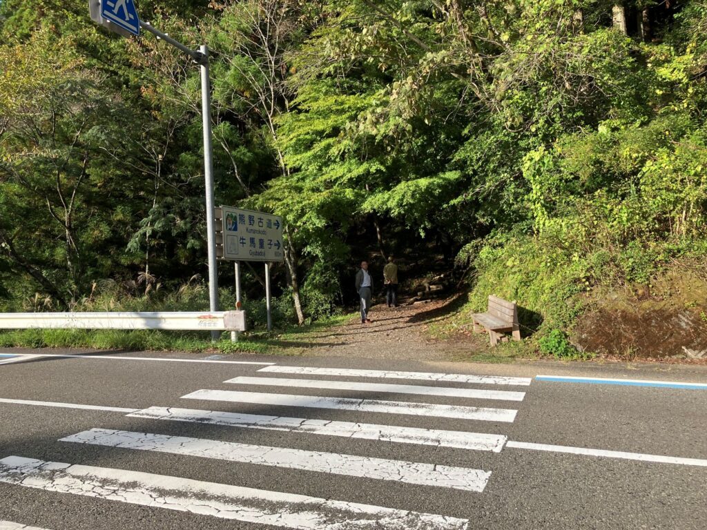▲移動の途中で立ち寄った「牛馬王子(ぎゅうばおうじ)社」近くの休憩所から熊野古道を望みます。