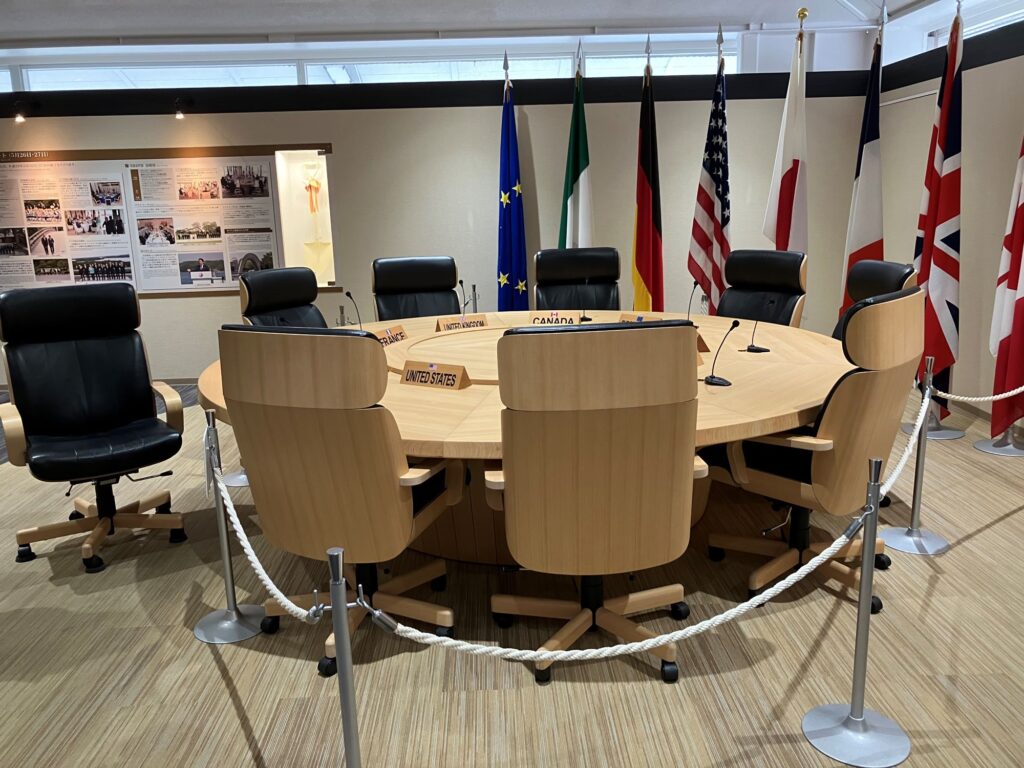 館内では係の方から記念館の意義や展示物について説明を受けながらG7首脳の等身大パネル、実際に使用された円卓や椅子、サミットの様子を紹介する映像、各国首脳への贈呈品などを見学します。