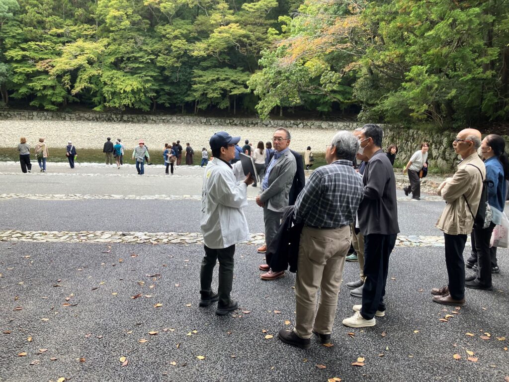 伊勢神宮内宮に到着後は、「宇治橋」のたもとにある「おはらい町」で昼食をとり、案内役の方と合流し、伊勢神宮に関するさまざまな説明を受けながら境内を巡ります。